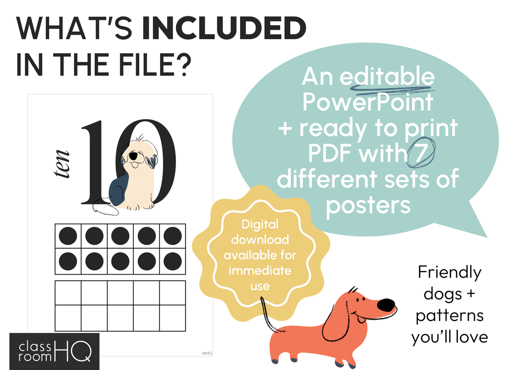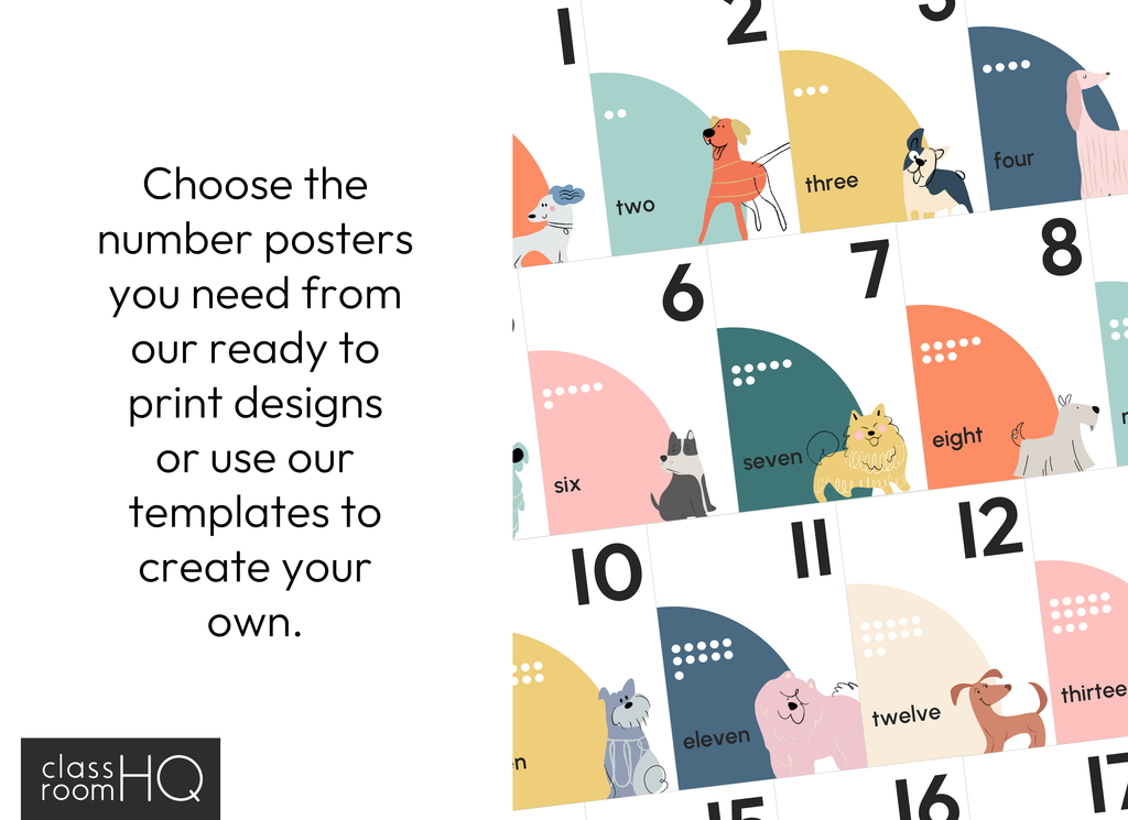 Made to match the rest of our DOG DAYS Classroom Decor, these modern colours will provide a clean calming learning space while providing the perfect level of support for young learners developing their number sense or as visuals in older classrooms.