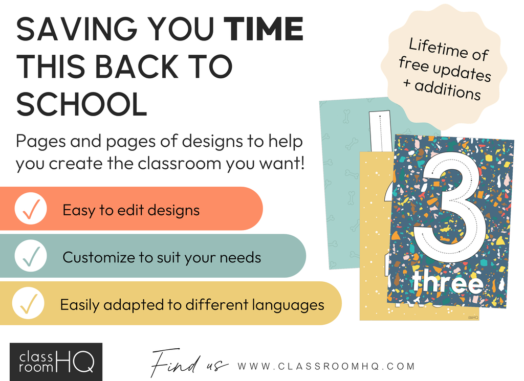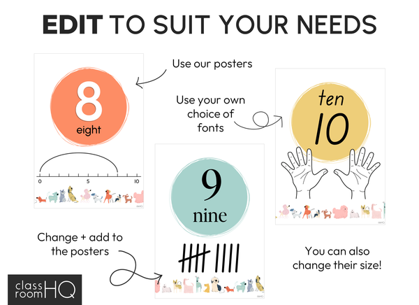 Add them to your math wall or create a purposeful classroom display. Choose from seven different sets of number posters included from tracing number posters for prewriters to editable posters that can be used to create your own math displays - number lines, times tables, skip counting posters and more.