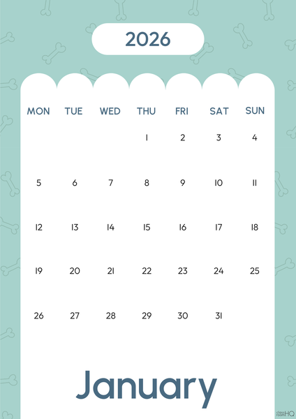 12 month DOG DAYS themed calendar (January-December 2025 + 2026) PORTRAIT VIEW - 1 month per A4 page PDF