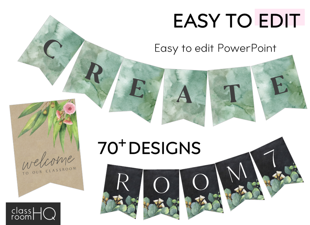 - Editable bunting flags (multiple designs with eucalyptus accents)