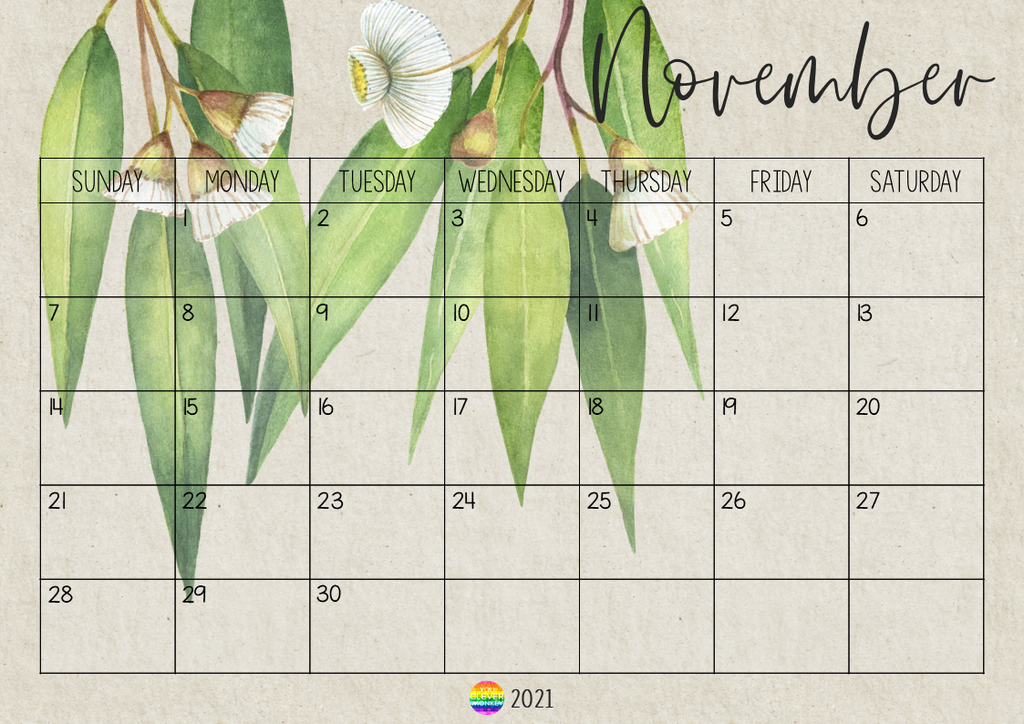 12 month editable GUM LEAF themed month to a page calendar LANDSCAPE VIEW - 1 month per A4 page