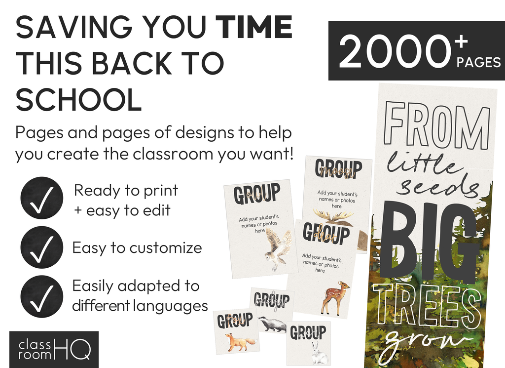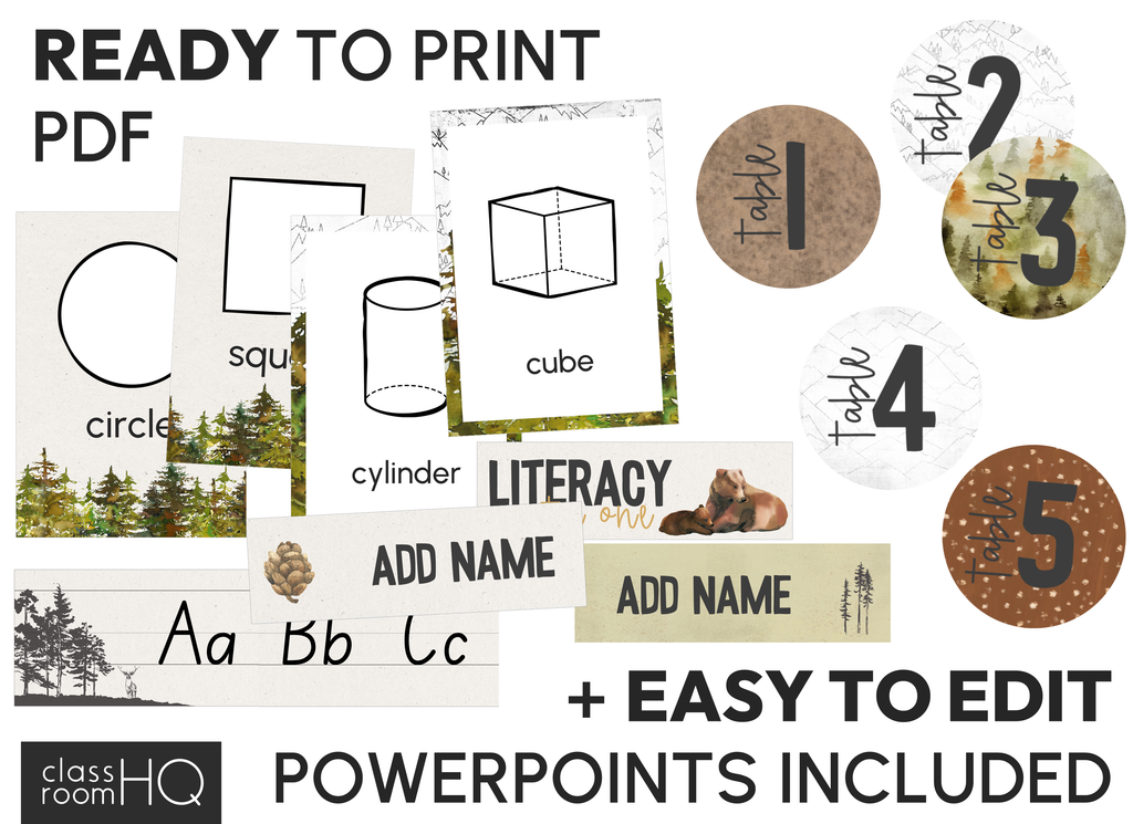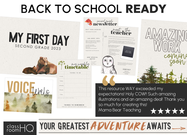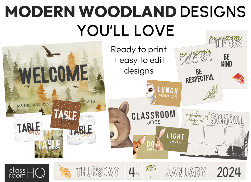 You will adore this nature inspired classroom decor with it's warm earthy color palette, watercolor forest trees and woodland creatures, timber elements and hand drawn silhouettes!