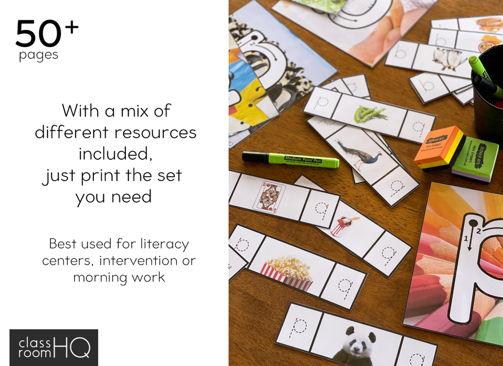 Choose from a range of different visual supports and hands-on activities - traceable letter cards with real photo backgrounds, posters to display in class or add our unique photo cards to your next literacy centre rotation so young children can practice differentiating between the letters p and q by using real life photos beginning with the same sounds as prompts. Laminate the cards and add some whiteboard markers to practice writing each letter or just add some pegs to clip the correct letter.