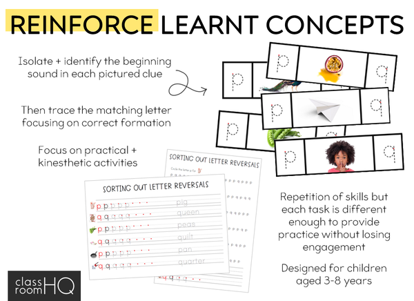 Letter confusion is common in young children as they learn the directionality of text but if you have students reversing their letter p's and q's and want some practical activities for them to become more confident in identifying and writing their letters correctly? This pack is just what you need to help fix letter reversals.