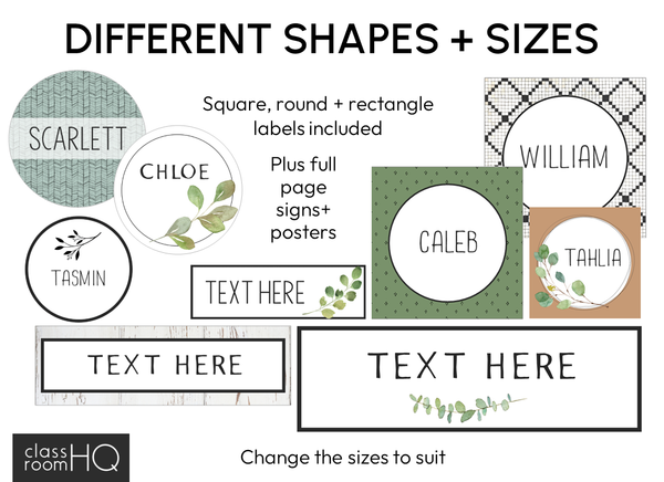 Lots of leafy green botanicals and natural timbers along with man made elements like tiles, ship lap, modern patterns, watercolour artwork, hand drawn elements and chalkboards are paired beautifully with olive and sage greens, pale mint, toffee browns and plenty of crisp black and white in this MODERN FARMHOUSE Classroom Labels + Signs Pack.