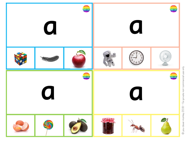 Ask your children to match the letter on the card to the matching beginning sound of one picture. You can make them self checking by placing a small sticker on the back of the card.
