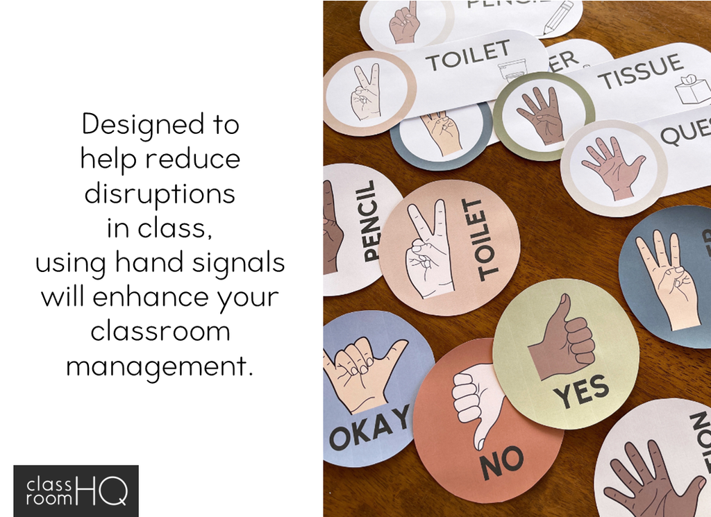 Using hand signal signs in class can be an effective classroom management strategy to help reduce interruptions during class time. Hand signals enable students to engage in multiple ways as they allow students to communicate their needs, both verbally and nonverbally, making for a more inclusive classroom.