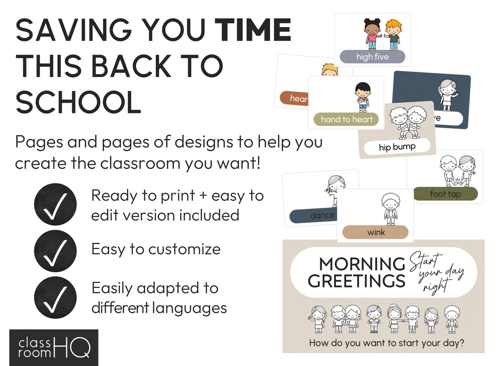 Simply hang the greeting signs and posters near your classroom so students can choose a morning greeting before entering. With the different choices included, swap some in and out during your school year to keep it fun!