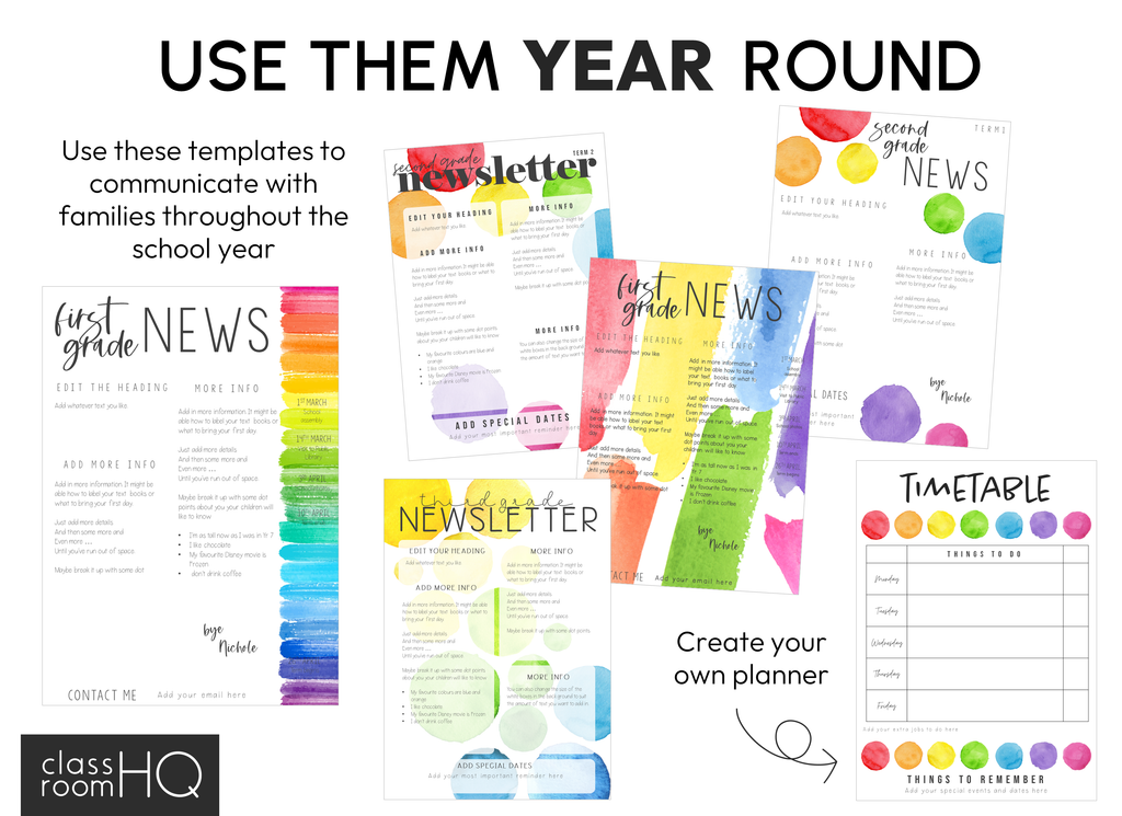 Made to compliment the rest of our WATERCOLOUR PAINT Classroom Decor, easy to edit, grab this pack of letters and class newsletters and get organised this back to school with over 60+ pages to choose from. They're perfect for your open house and meet the teacher nights or to send them home before school starts. Use the newsletters to communicate with your families throughout the year or print out the timetable pages for your teacher planner to keep yourself organised.