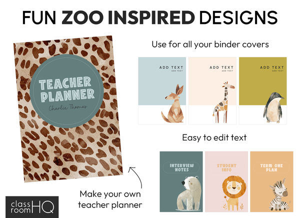 Organize your classroom materials with a touch of whimsy and style using our Editable Binder Covers, featuring a modern colour palette and fun zoo animal illustrations. Perfect for teachers who want to bring a lively and engaging element to their organization system, these binder covers are fully customizable. Keep your classroom tidy, visually appealing, and filled with delightful zoo animals with these stylish yet practical binder covers.