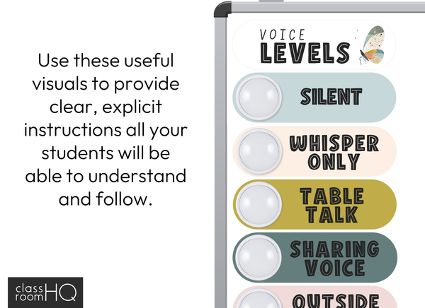 Designed with a modern colour palette, this voice level display provide clear visual cues for young children who benefit from visual reminders in class. Perfect for elementary teachers, using these voice level signs as part of your classroom management strategy help students understand and adhere to appropriate noise levels during different classroom activities.