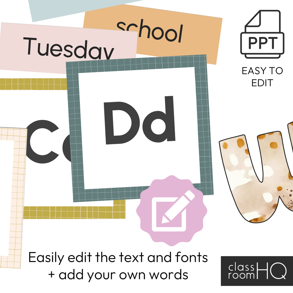 Our editable files allow you to change and customize the text so you can make it exactly what you want to fit your classroom. Simply type into the text boxes provided or add in your own to edit. You will need access to Microsoft PowerPoint to do this.